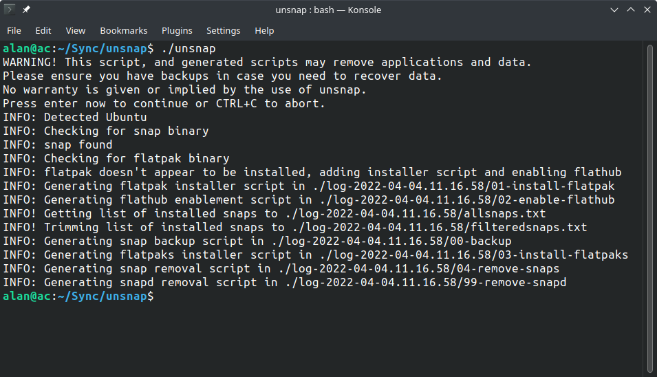 Vous pouvez exécuter n’importe quel script ou ceux qui vous conviennent ; il est préférable de commencer par une sauvegarde et ensuite vous pouvez exécuter ./03-install-flatpaks et ./04-remove-snaps pour télécharger l’équivalent de vos programmes avec flatpaks et ensuite supprimer les programmes snap.